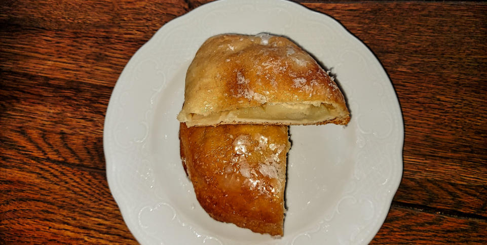 Hälfte verteilen, mit Zucker bestreuen und zusammenfalten.