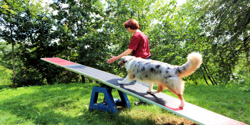 laufen, wenn oben auf dem Agilityplatz Hunde trainieren