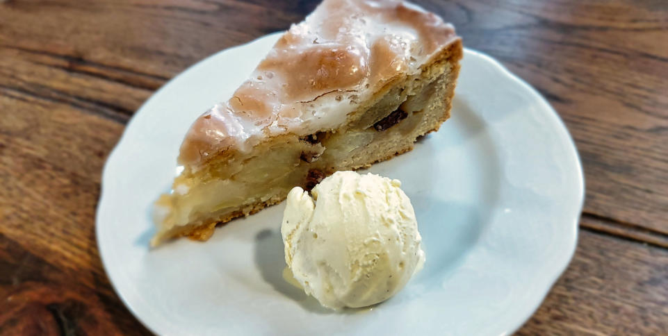 Wenn die Äpfel kalt sind in die Backform füllen, mit etwas