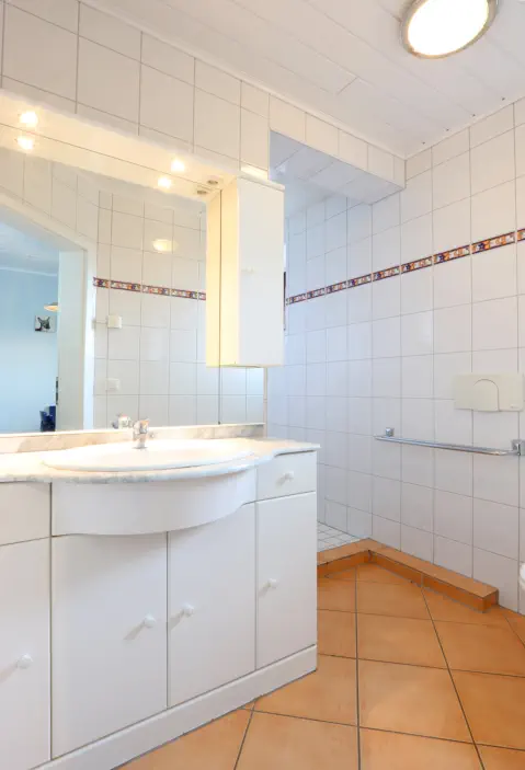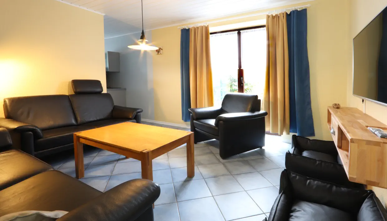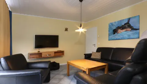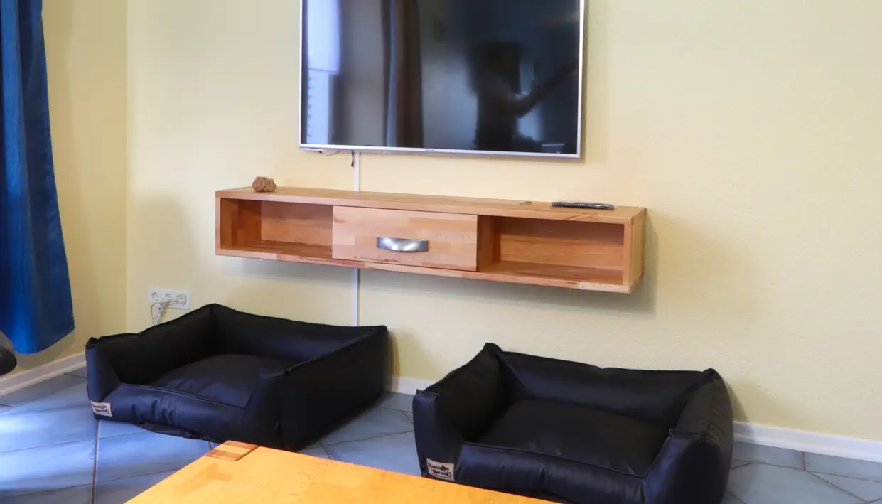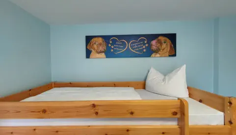•	Ferienwohnung im Erdgeschoss  •	2-4 Personen •	10 Hunde •	ca 80 m²  •	Eigener eingezäunter Garten, Zaun ca 1,50 hoch, das Tor ist ca 1,20 hoch •	Eigener ebenerdiger Hauseingang •	Der eigene eingezäunte Garten ist aus dem Wohnzimmer über eine Gartentreppe mit 4 Stufen zu erreichen •	Zum Be- und Entladen kann man mit dem Auto direkt vor der Haustüre fahren •	Der Parkplatz befindet sich gegenüber der Anlage auf der anderen Strassenseite •	Anreise ab 16:00 Uhr, Abreise bis 12:00 Uhr